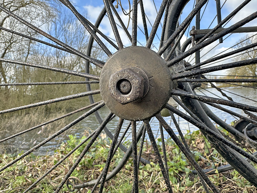 This 1885 Singer tricycle with forward steering is a rare survivor in excellent original condition. It had been in storage for many years before I bought it, owned by a long-time vintage bicycle collector. Though it was marketed for children, as you can see in the video further down the page, it is quite suitable for shorter adults too – I filmed my wife taking it for a spin for the first time, and she is 5ft 3″.