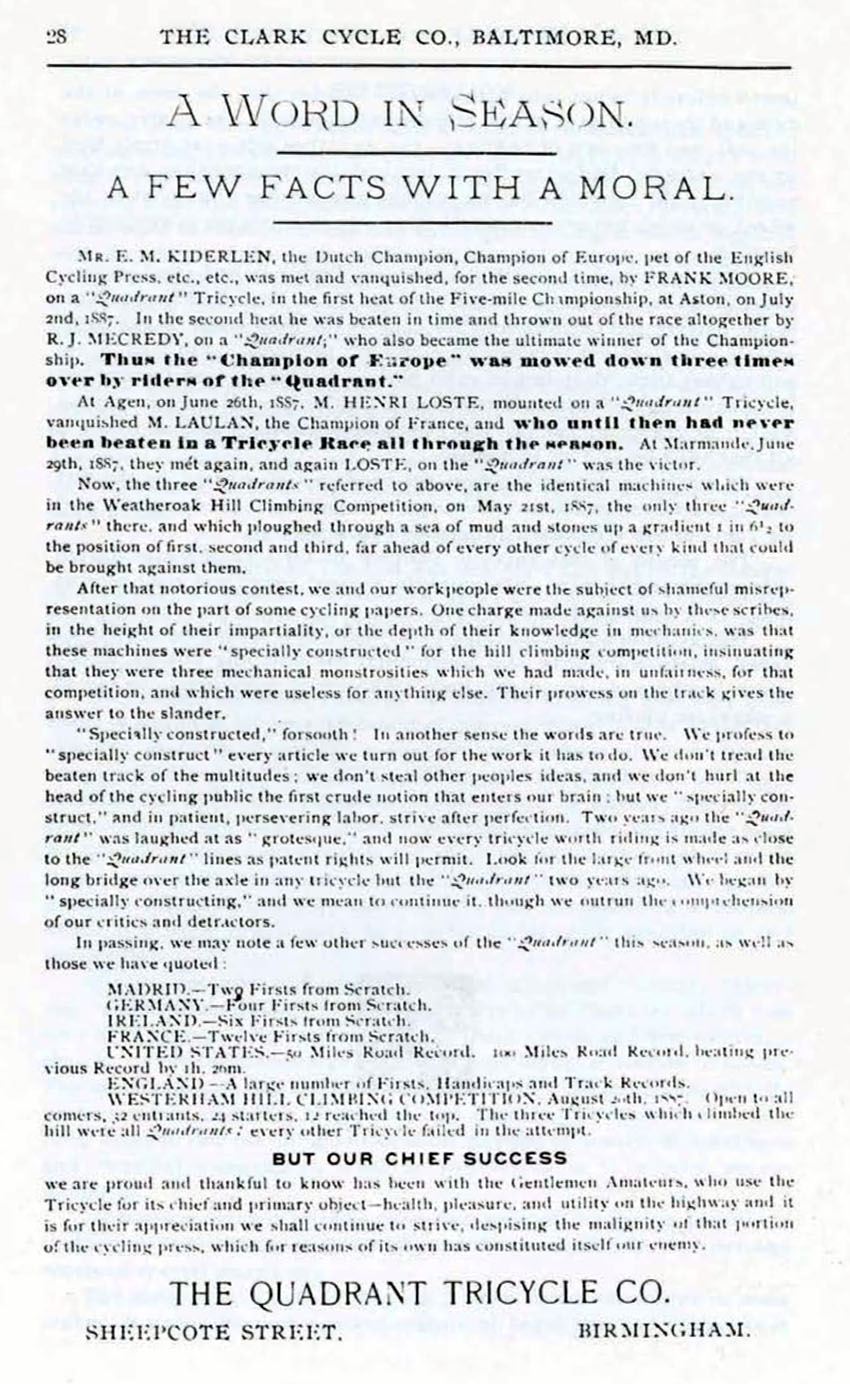 The Quadrant No 8 Gents’ Tricycle was the top machine of its era. Its light weight made it suitable for racing, and many successes were recorded in 1886 after the tricycle made its debut.