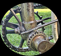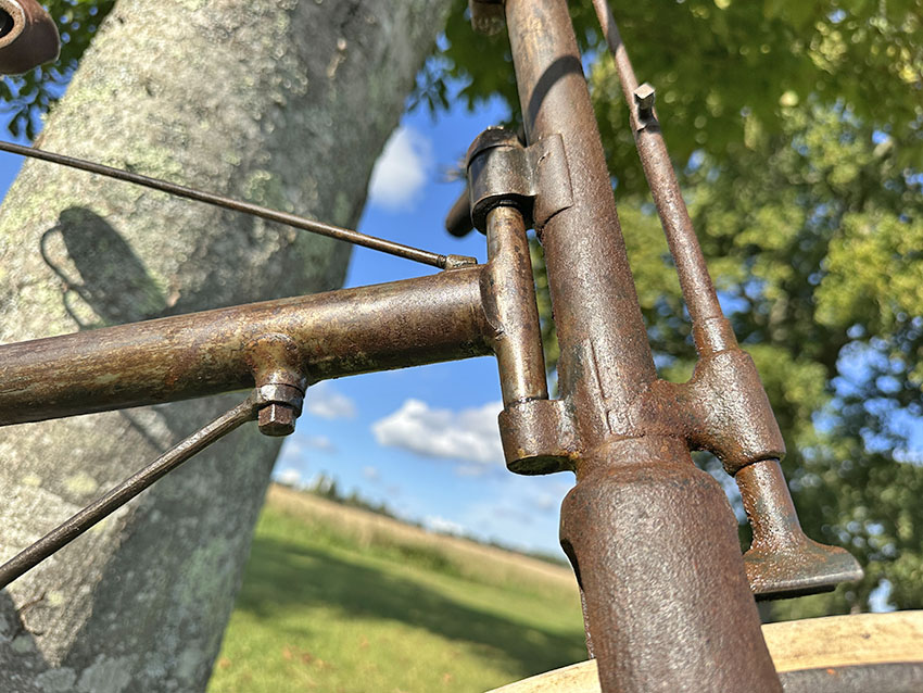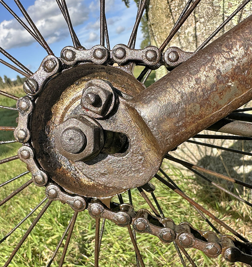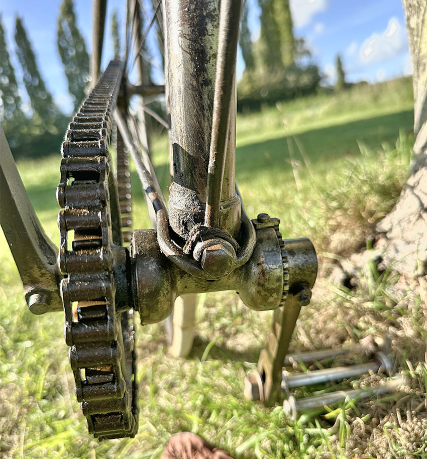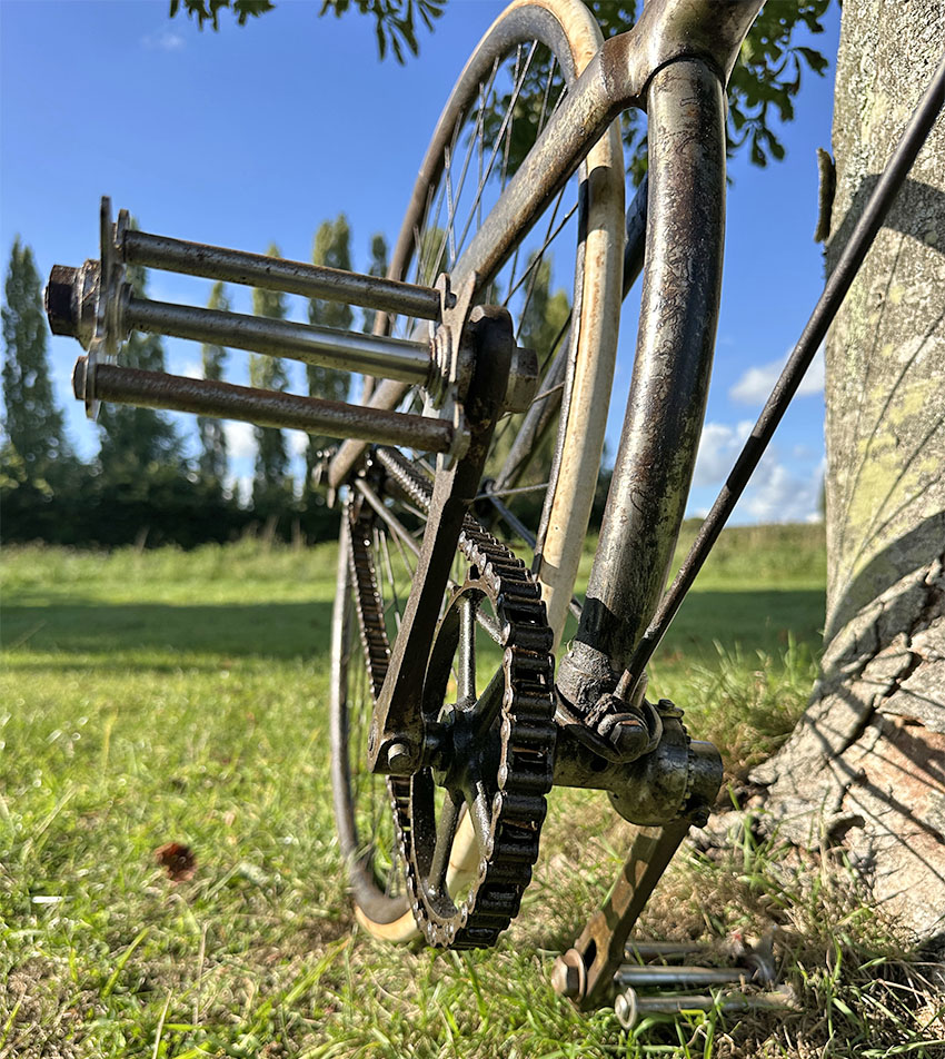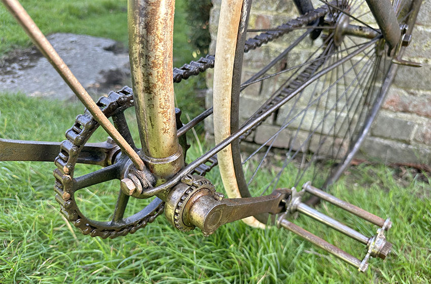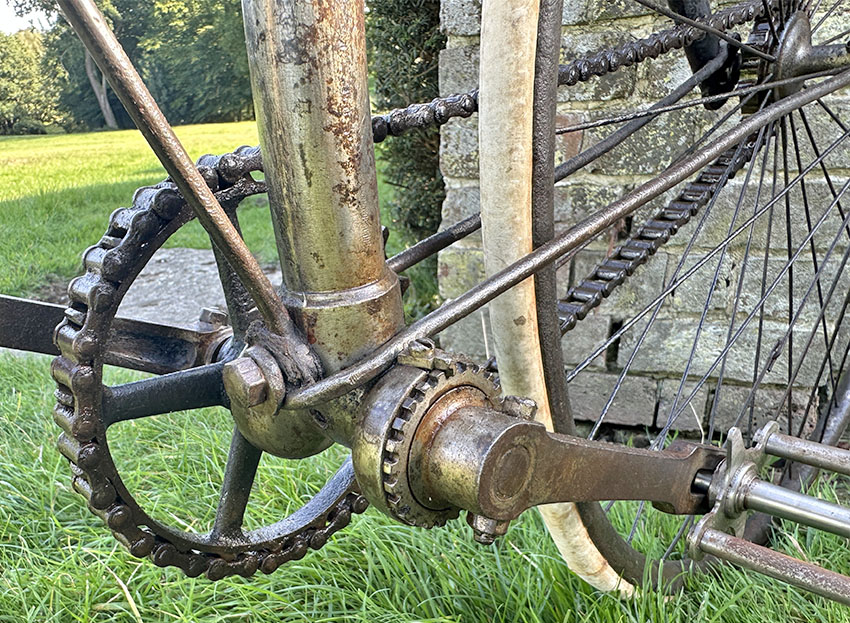 There’s an interesting bottom bracket arrangement on this c1889 Crossframe Safety Bicycle, to adjust and lock the cone in place. I’ve not found it in my database of British crossframe safety bicycles.