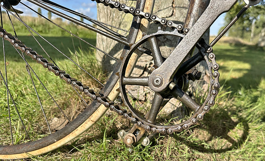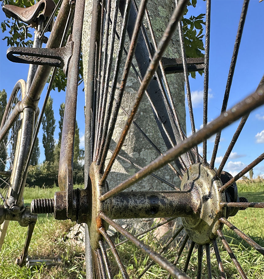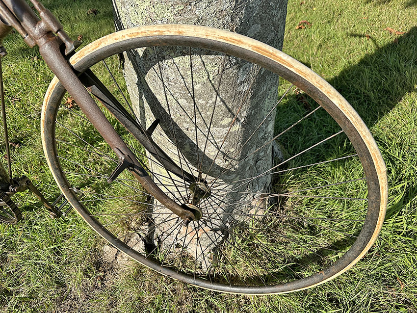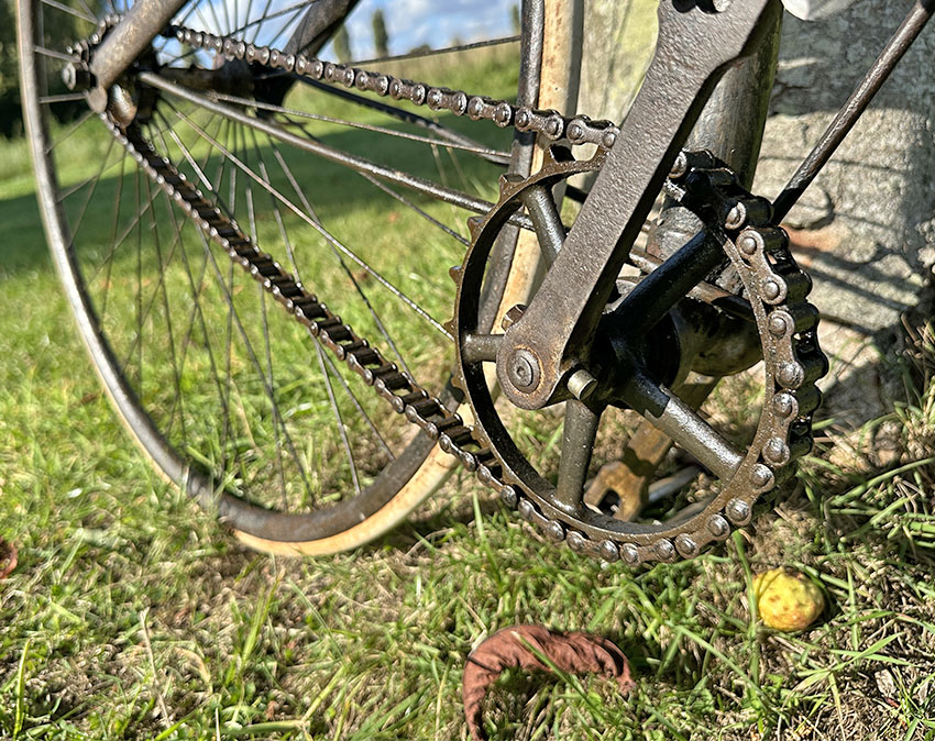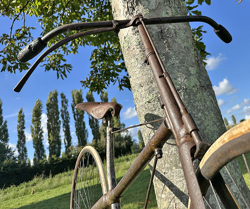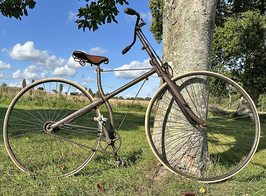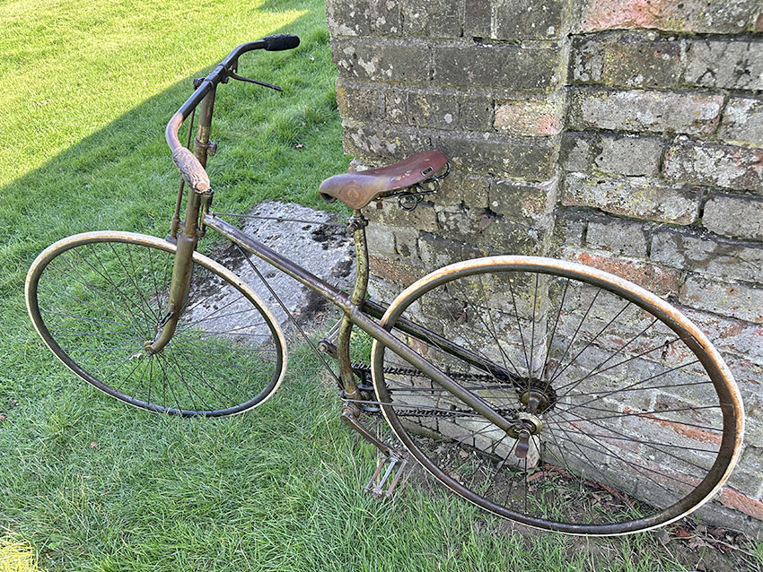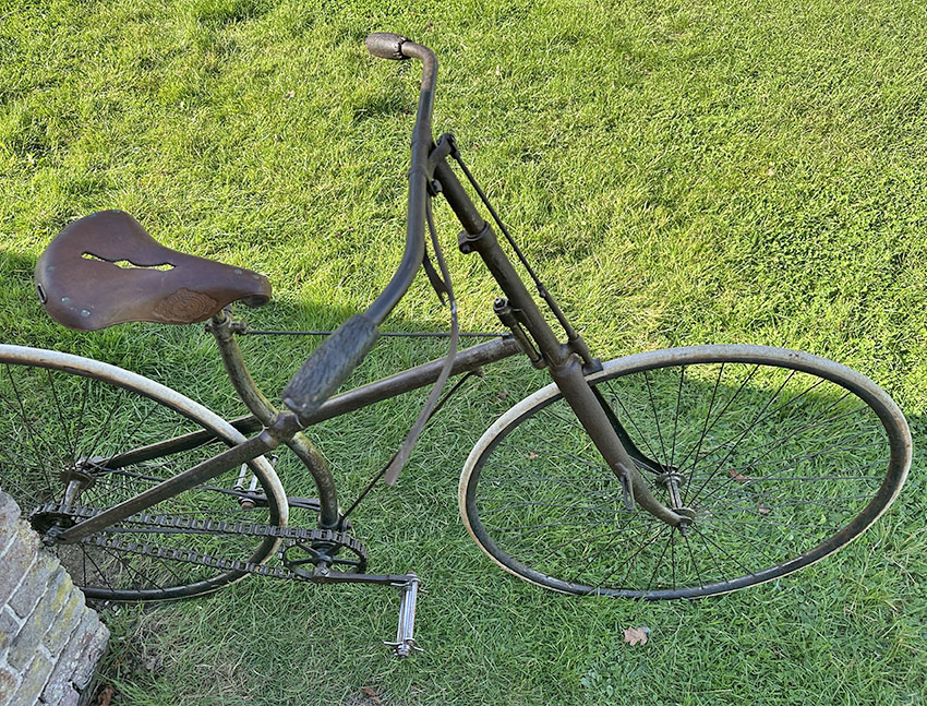 It was a state-of-the-art machine in its day, though soon to be superseded by bicycles with diamond frames, ball head steering and chain adjustment at the rear dropout. It has had a rim repair on the back wheel and the saddle has a replacement leather top. It’s in good original condition all round and ready to ride.