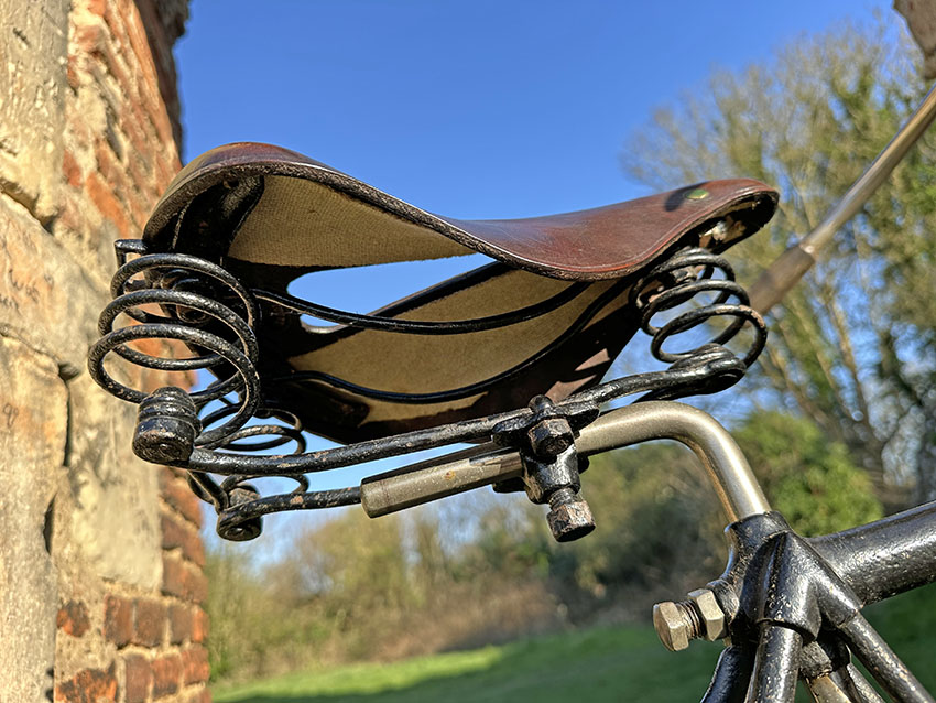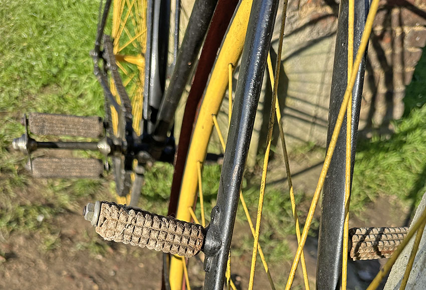 This example is an old-time restoration. Its paintwork has weathered a bit, though the nickel brightwork is still shiny. The only job I would do on it is to rub off the yellow paint on the spokes and hubs. It’s always a good idea to grease up the plain bearings on the open steering before riding a safety bicycle of this era, otherwise it’s ready to ride.