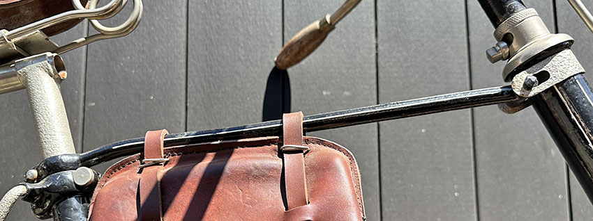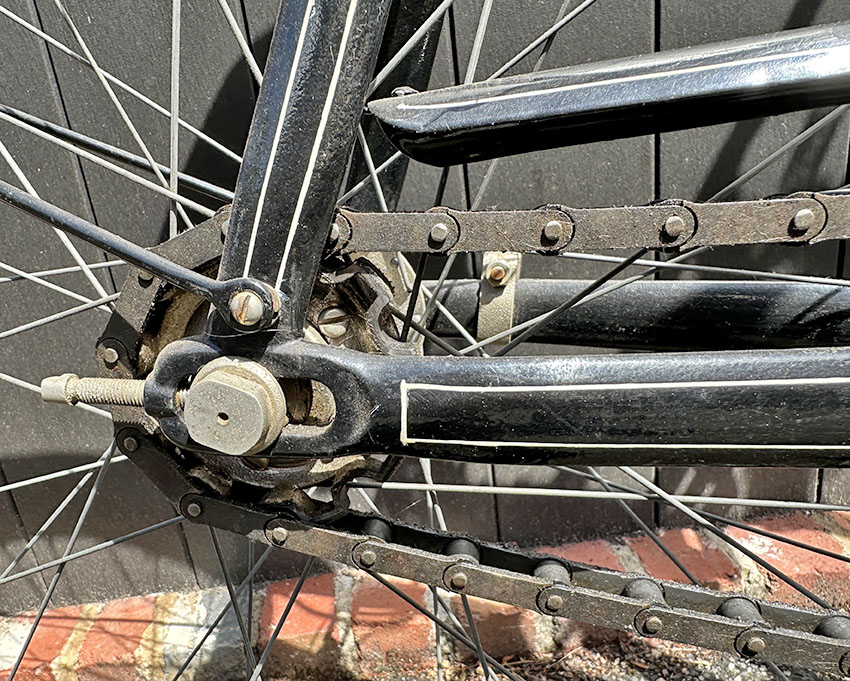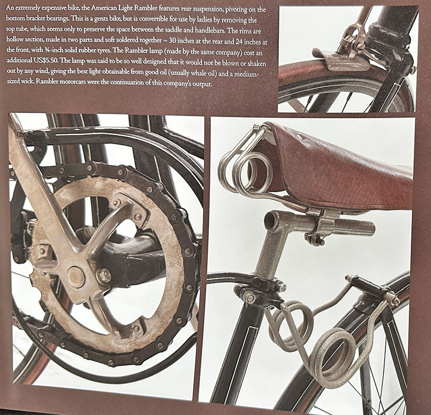 3. It’s a Convertible. Though that word is more familiar these days to describe top-of-the-range cars with a roof that folds down, the first use of the word described a bicycle such as this – with a removable top tube that converts it from a gents model to a ladies. This feature was popular from 1888 to around 1890, and enabled manufacturers to save production costs by building just one style of frame. America’s cycle industry was in its infancy in this era, and most of the bicycles on the US market were imported from Britain, so they sold Convertibles beyond 1890 while Britons were already buying newer designs.