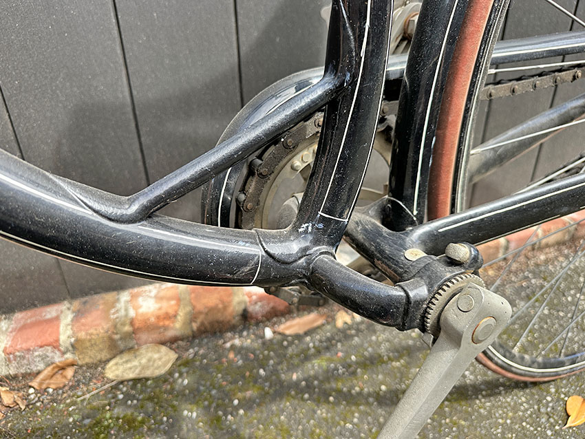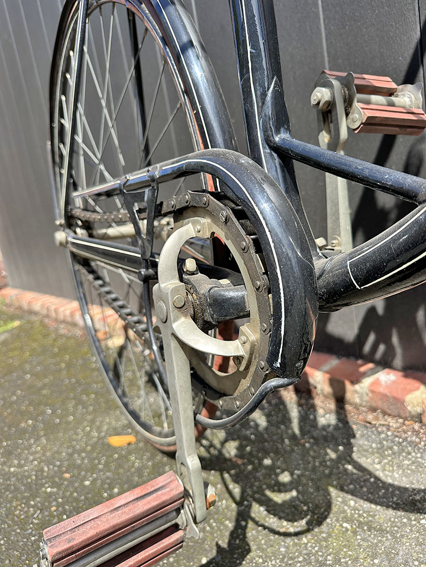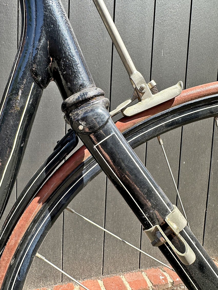 The hinged rear fork on the model range was designed to combat vibration, the company describing the bicycle as a ‘spring frame.’ The rear spring combined with the forward angle of front fork (below) provides this machine with a unique profile.