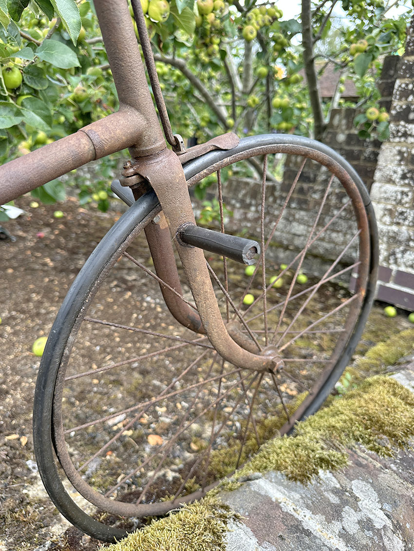 I’ve no idea where this delightful child’s crossframe safety bicycle has been hiding all these years, but it has obviously been cherished for many decades. The front solid rubber tyre has stretched (a common issue) and the brake lever and saddle have been replaced at some time. I fitted replica grips of the correct style. Apart from these additions it looks quite original and is in very sound condition all round.