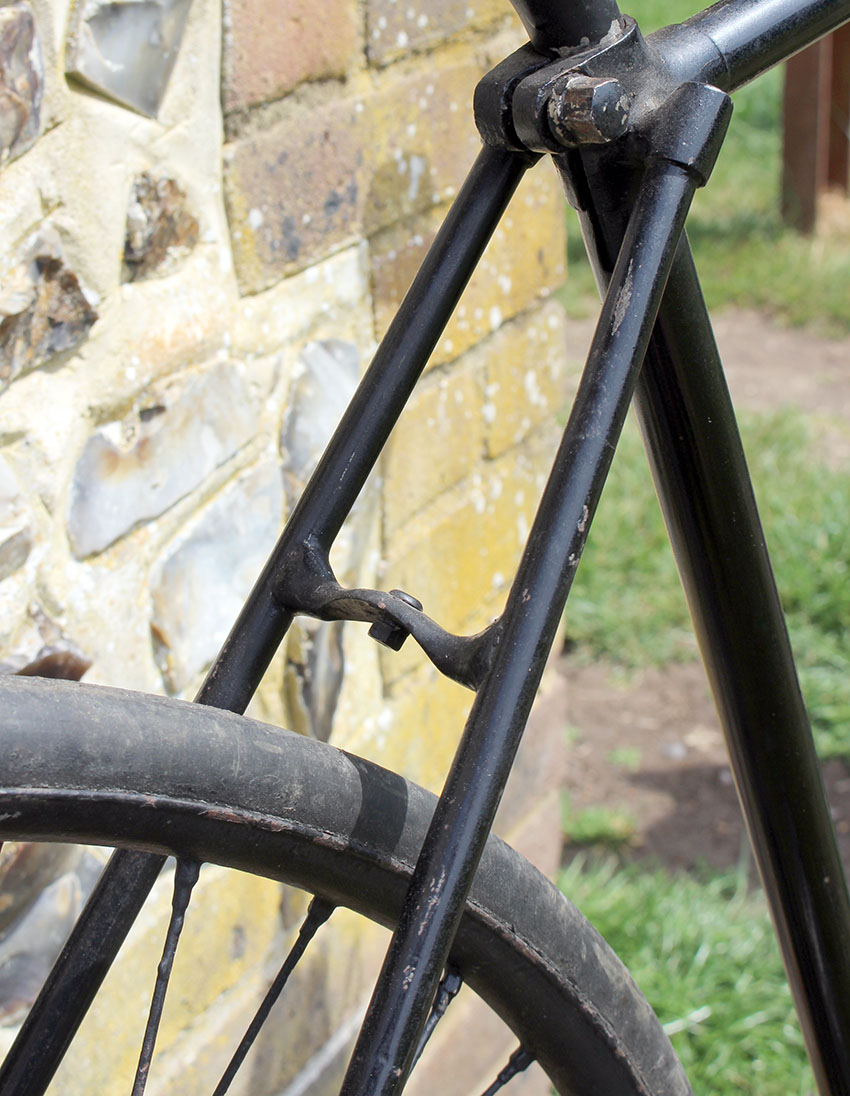 After bicycle design changed in 1885/1896 to a diamond frame with a horizontal top tube, this style of machine with an upward sloping top tube became a bit of a ‘dinosaur’, even more so if it had solid tyres, the most ‘old-fashioned’ option.