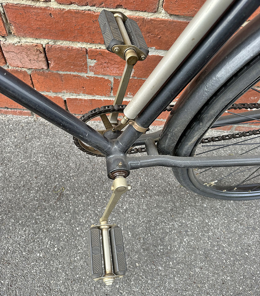This rare Star safety bicycle is an old-time restoration. As you can see in the photos, the original transfers (decals) on the down tube, seat tube and steering head were preserved when it was repainted. It has been on display at the Farren Collection museum in Melbourne; Paul Farren’s notes say “Bought from Annemarie in Canberra about 2008, as part of the sale of the bikes at the Canberra Tradesmans Bike Museum. I think they had purchased it in Western Australia from Barrett.” He also notes “The bike is fixed wheel with 30″ wheel on the front and 28 x1¾” rear. It has a wide block chain, oversized handlebars and direct spokes, the latter feature putting this bike around 1895. It has Welch rims, which were only used during the first years of the pneumatic tyre. It has footrests and a mounting step that were features of the early fixed wheel era.”