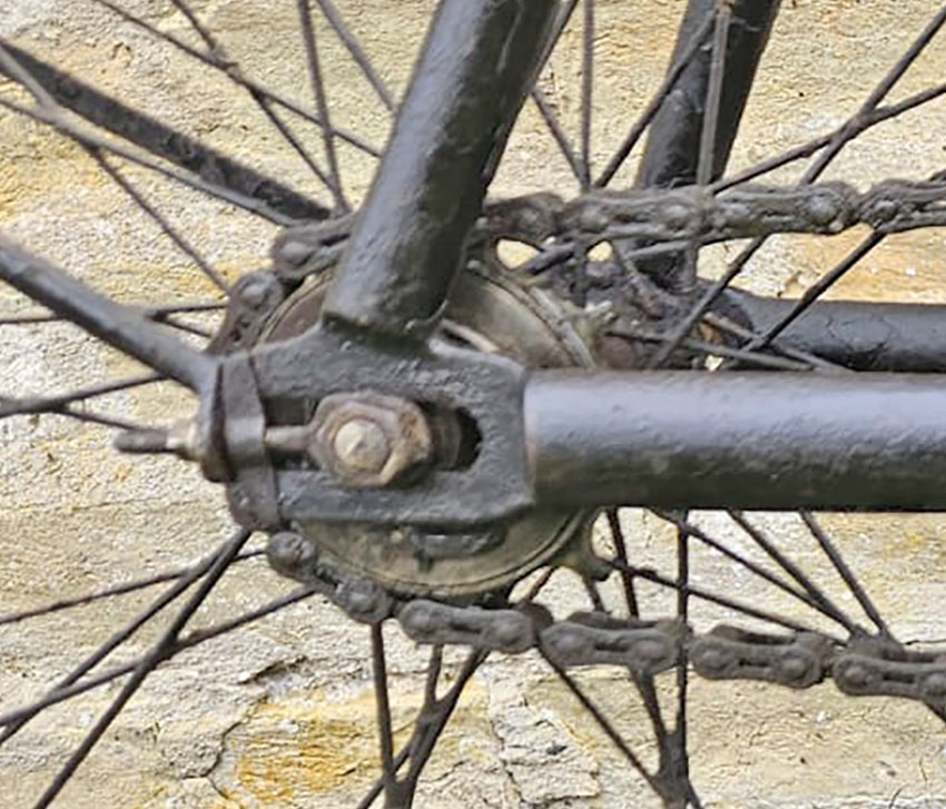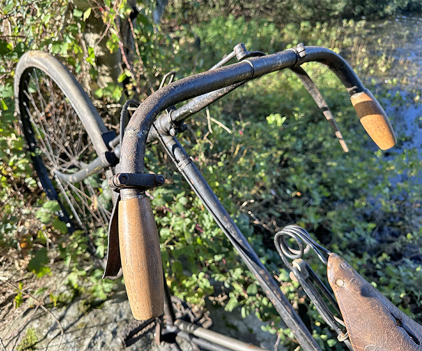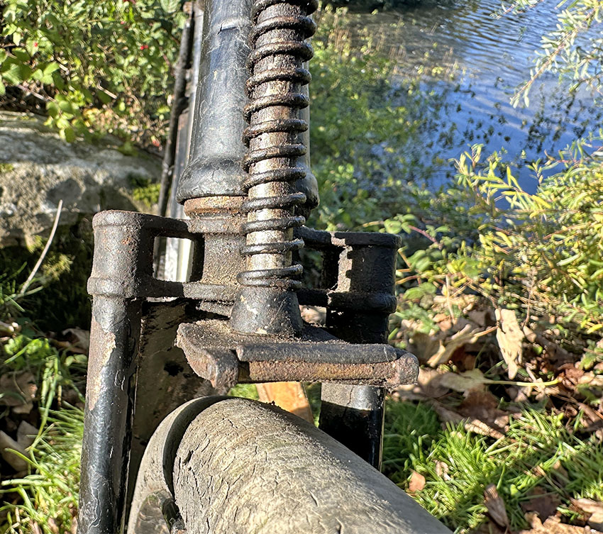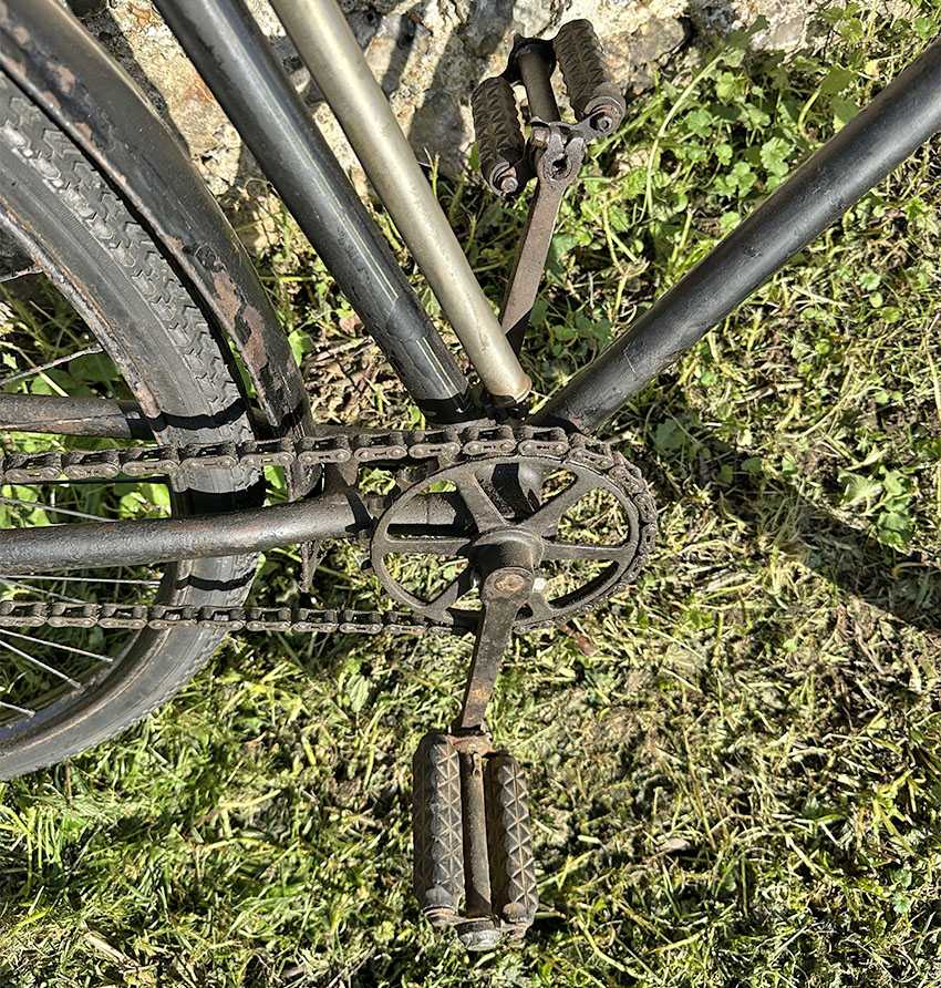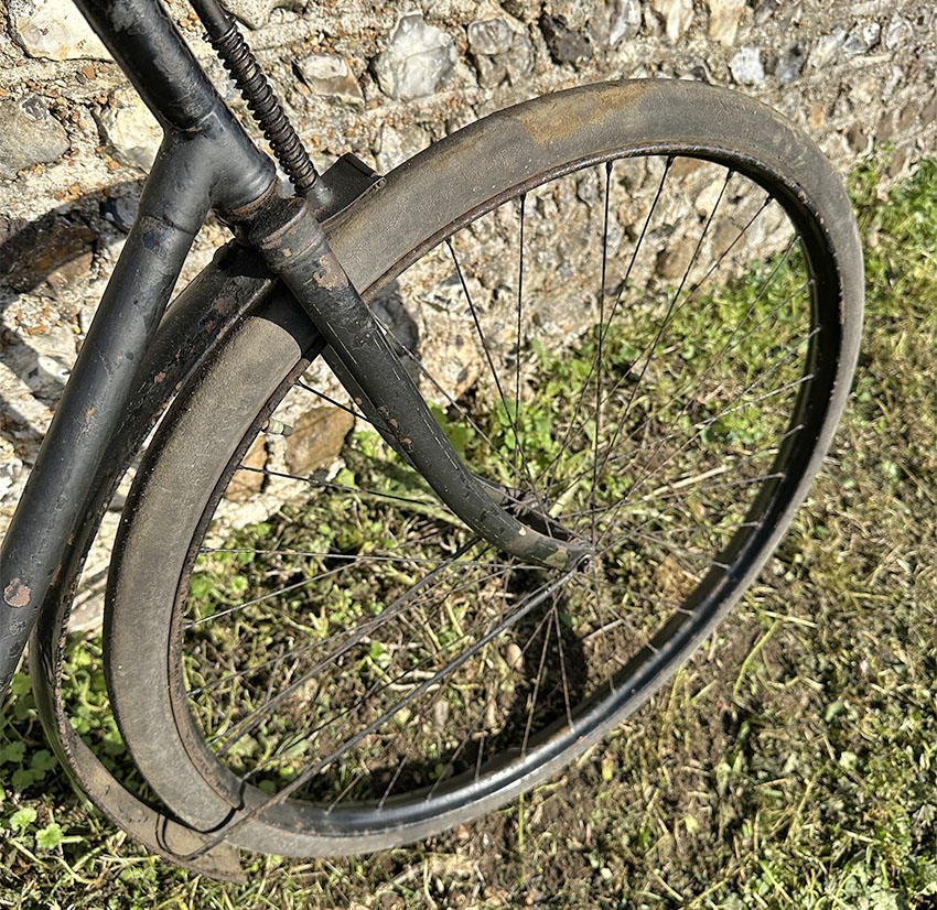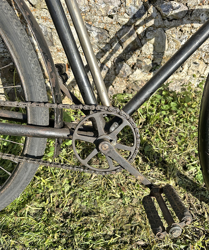This rare machine from Coventry Machinists’ Co was previously owned by my friend John for many years. It was originally fixed wheel (Freewheel was not introduced until 1899). As John got older he changed the rear sprocket to freewheel and added a Bowden cable operated rear brake to make it more suitable for regular road riding. It has a 30″ front wheel but I’m not sure if the tyre is a 28″ beaded edge tyre stretched onto the rim, or if John did something to the original 30″ tyre to preserve it.