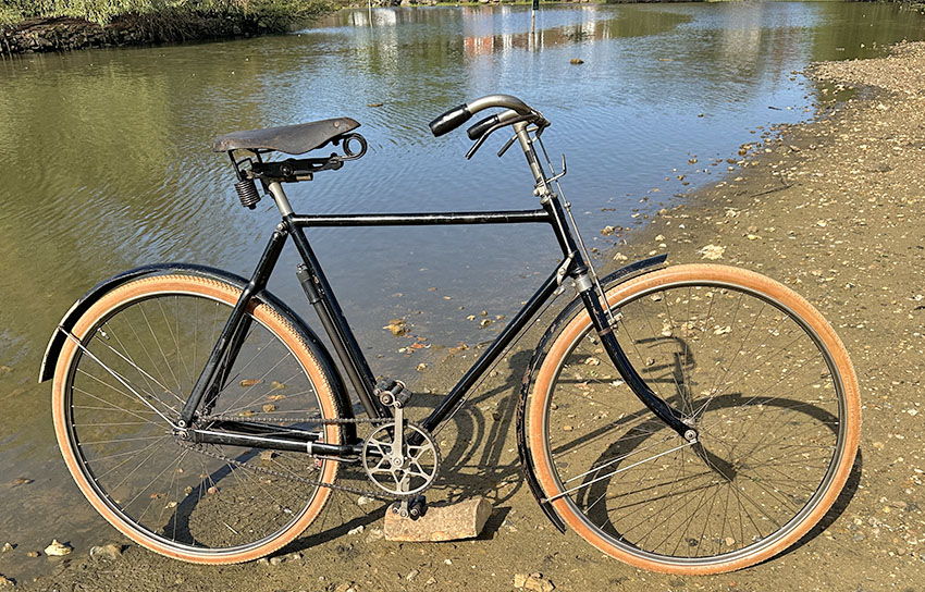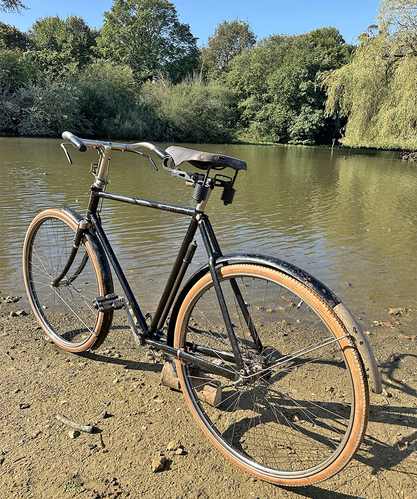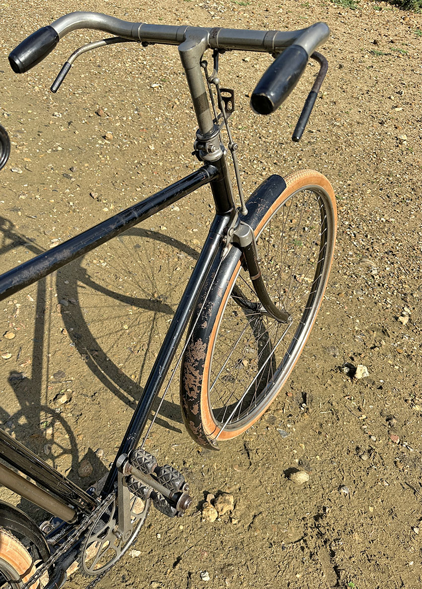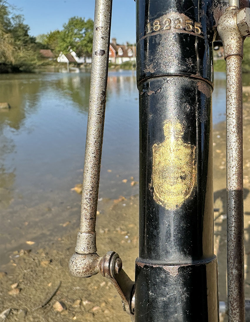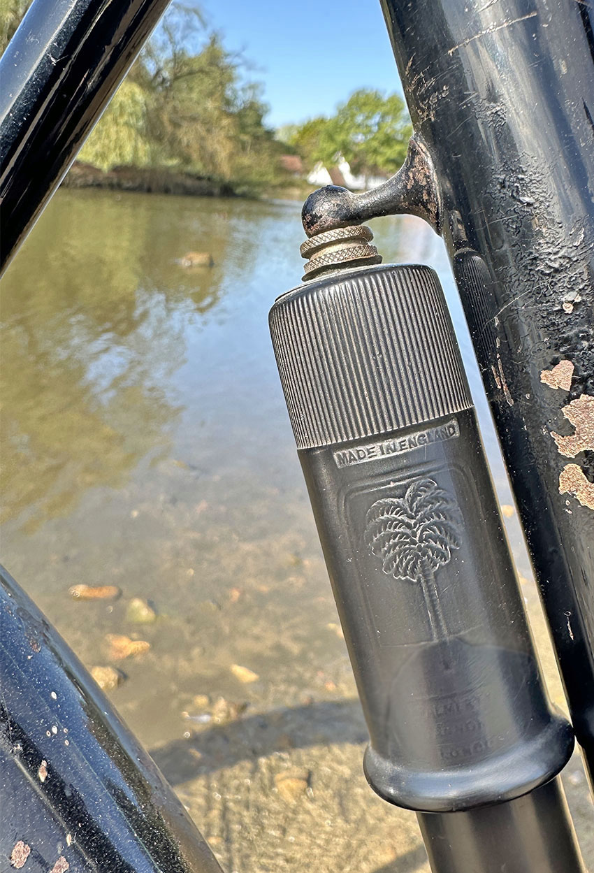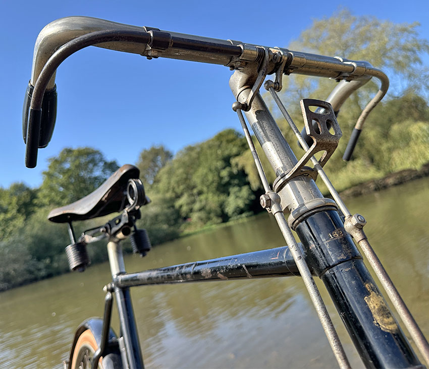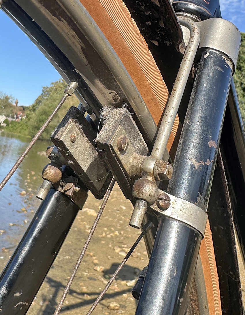This 113-year-old Triumph is in superb original cosmetic condition, with its original transfers (decals) intact, excellent nickel and a ‘Brown’ motorcycle style saddle. It is fitted with attractive four bar pedals and the inflator pump is marked ‘Kemp Bros, 11 Clintons Place, Seaford.’ (Kemp’s Garage opened in 1921). Its previous owner needed to repair the lower part of the seat tube: you can read about it at the bottom of the page. The Triumph has been serviced and is ready to ride.