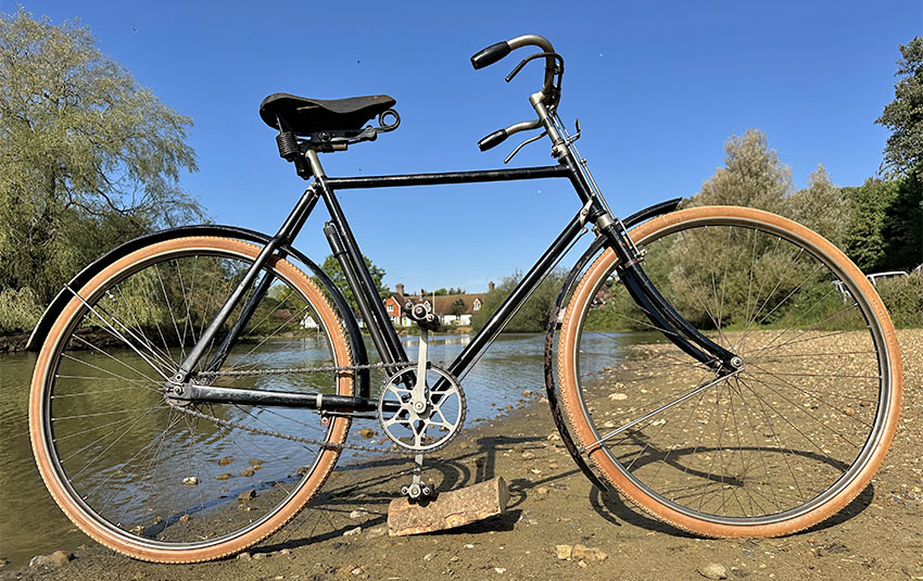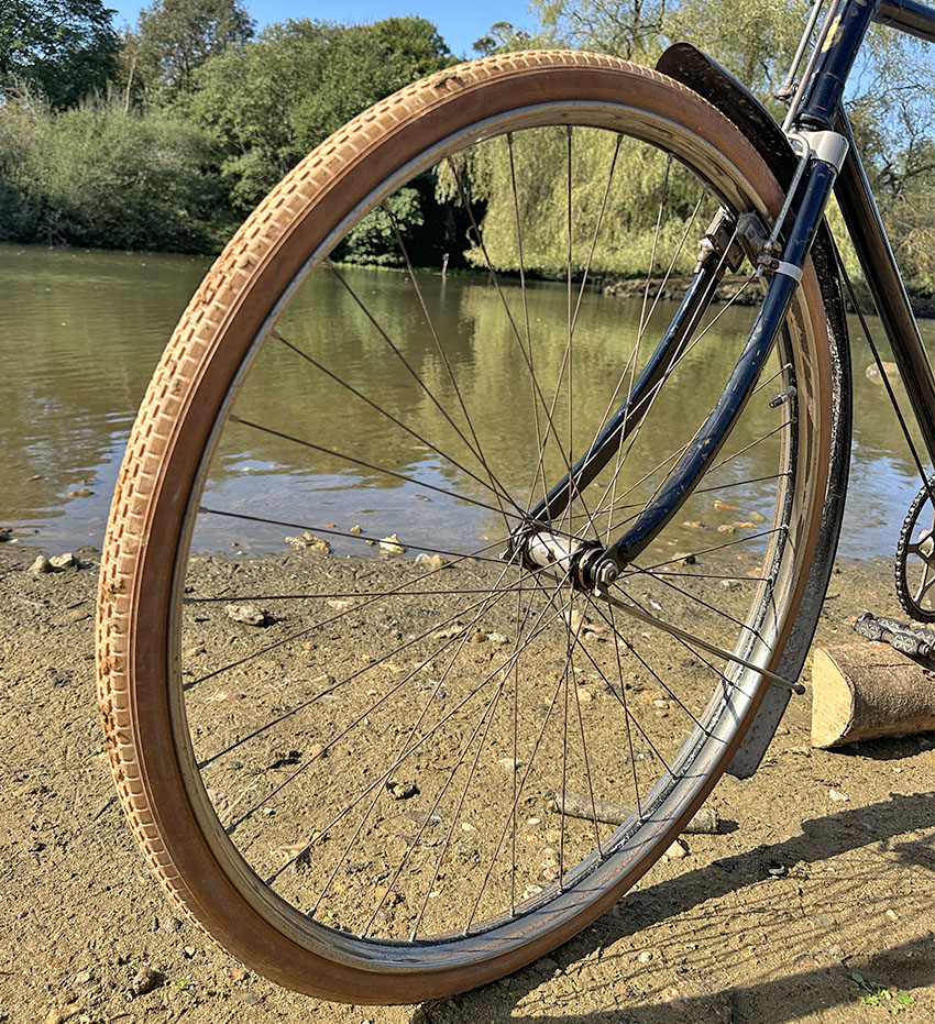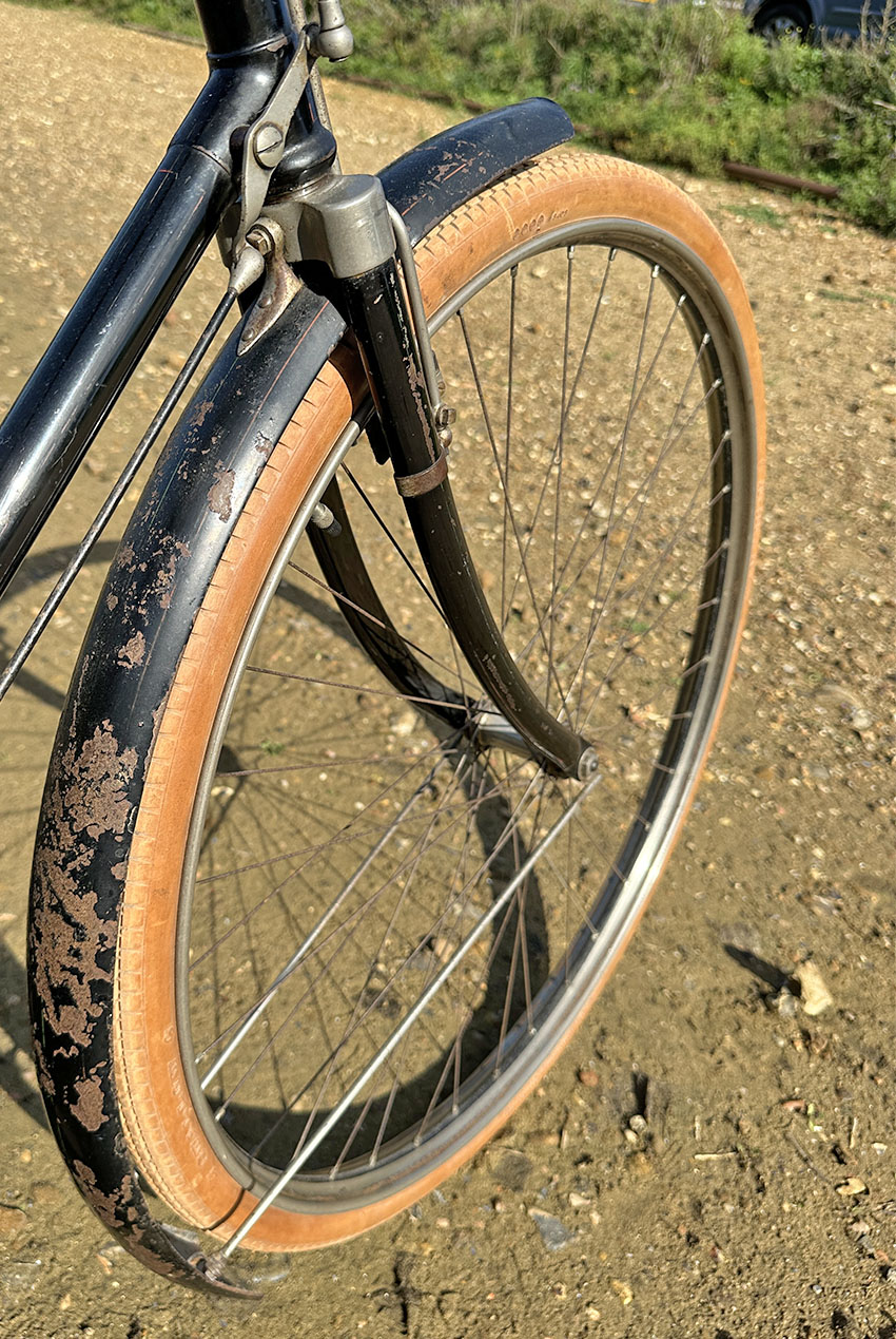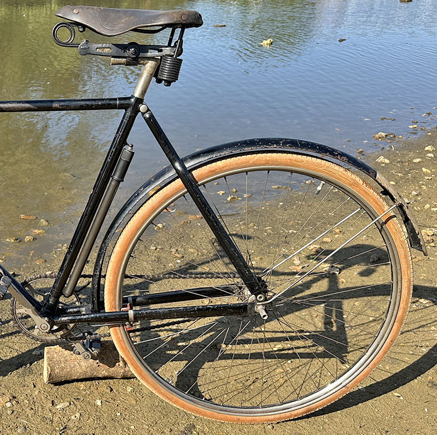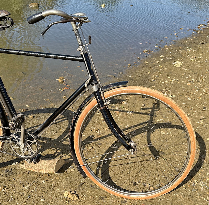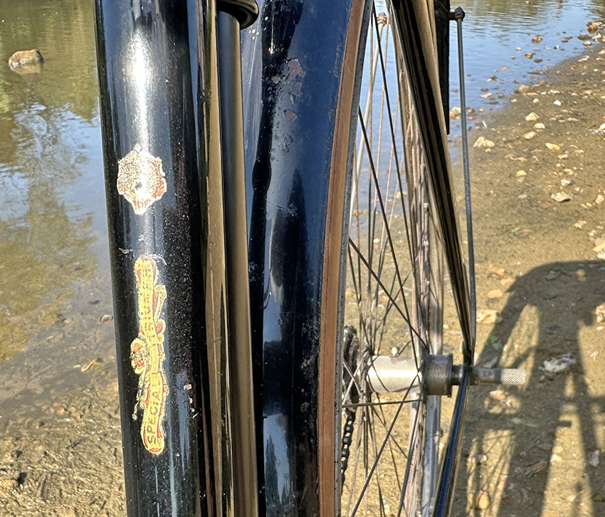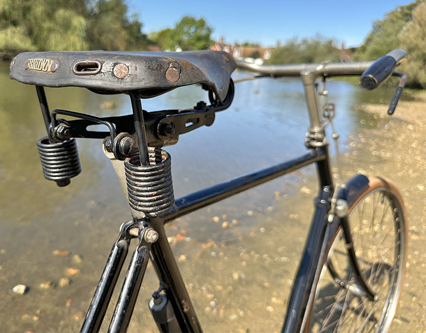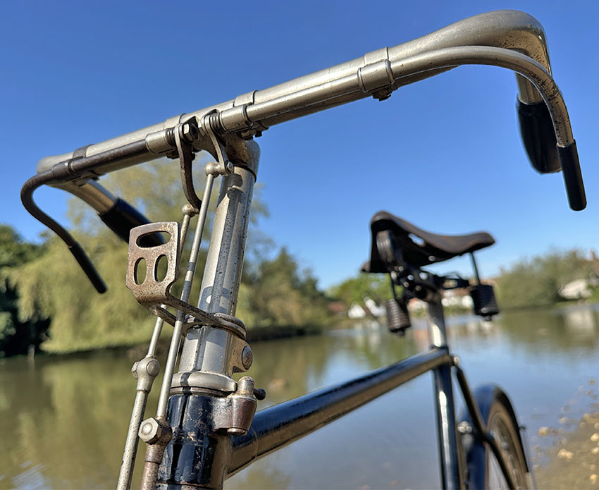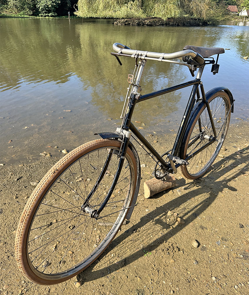 This 113-year-old Triumph is in superb original cosmetic condition, with its original transfers (decals) intact, excellent nickel and a ‘Brown’ motorcycle style saddle. It is fitted with attractive four bar pedals and the inflator pump is marked ‘Kemp Bros, 11 Clintons Place, Seaford.’ (Kemp’s Garage opened in 1921). Its previous owner needed to repair the lower part of the seat tube: you can read about it at the bottom of the page. The Triumph has been serviced and is ready to ride.
