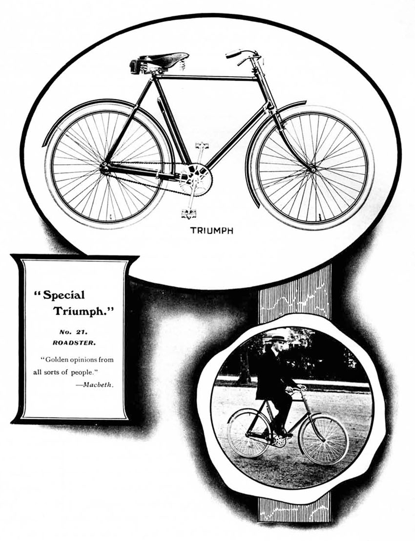 The Gent’s Imperial and Royal Triumphs were the company’s top-of-the-range models, priced at £14 19/- 3d and £12 1/- 6d respectively. The basic Royal without any extras was £9 13/-. The ‘Special’ Triumph took over from the ‘Standard’ as one of Triumph’s budget lines, and the model featured here, the Special No 21, cost £7 10/-. It became very popular because, despite the very reasonable price, the customer was still buying a bicycle made to the highest standards in Triumph’s own factory.