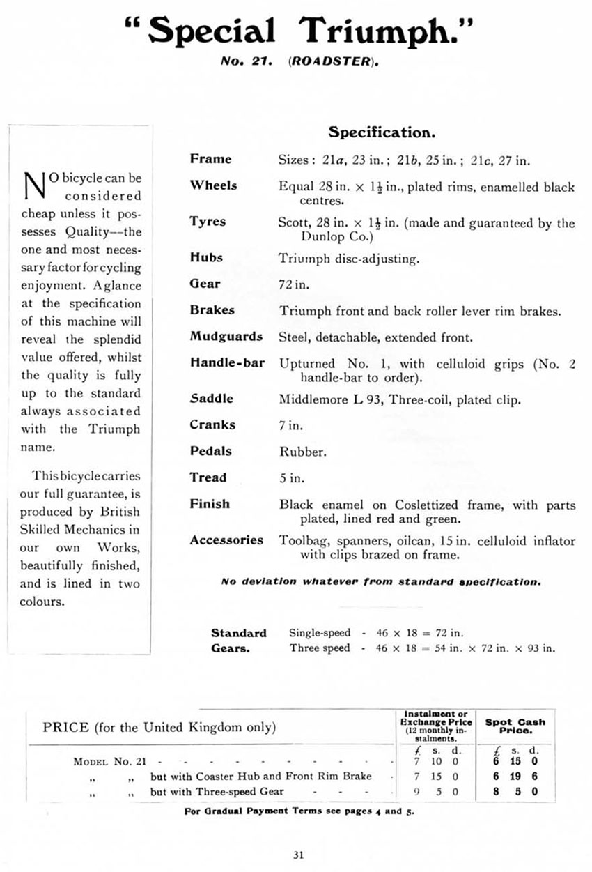 To compare prices with the current day, multiply the sale price by 100 (approximate): the Special Triumph No 21 would cost around £750 and the Imperial just under £1500.