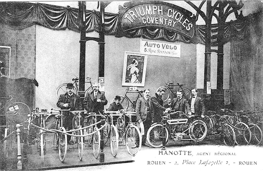In the decade preceding World War 1, the high quality of Triumph bicycles and motorcycles fuelled sales both at home and abroad. The European market was particularly strong, as you can see from the French postcard above.
