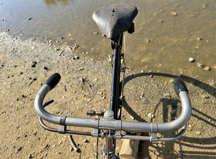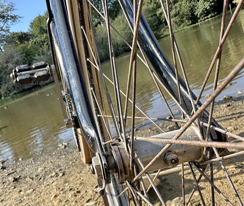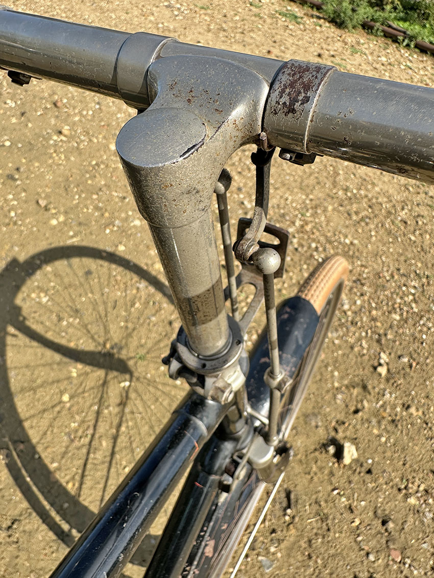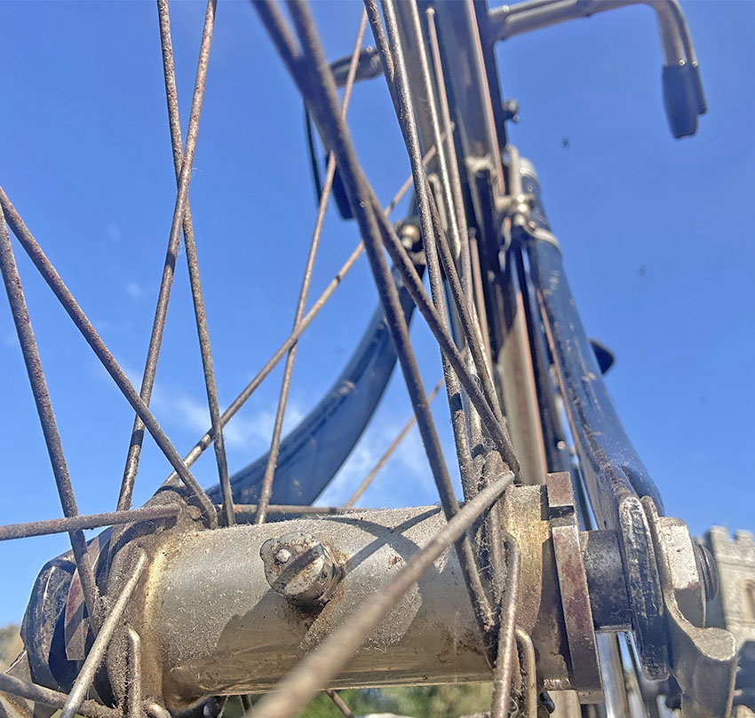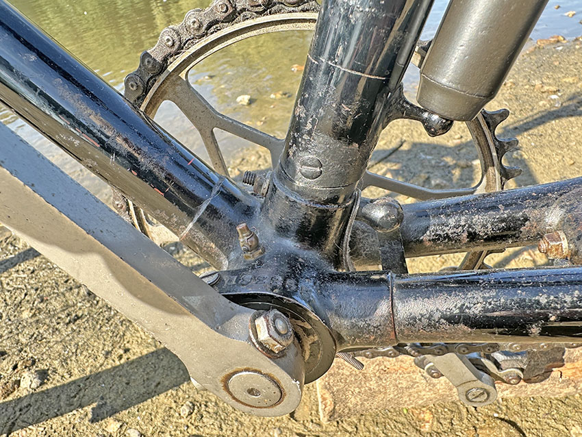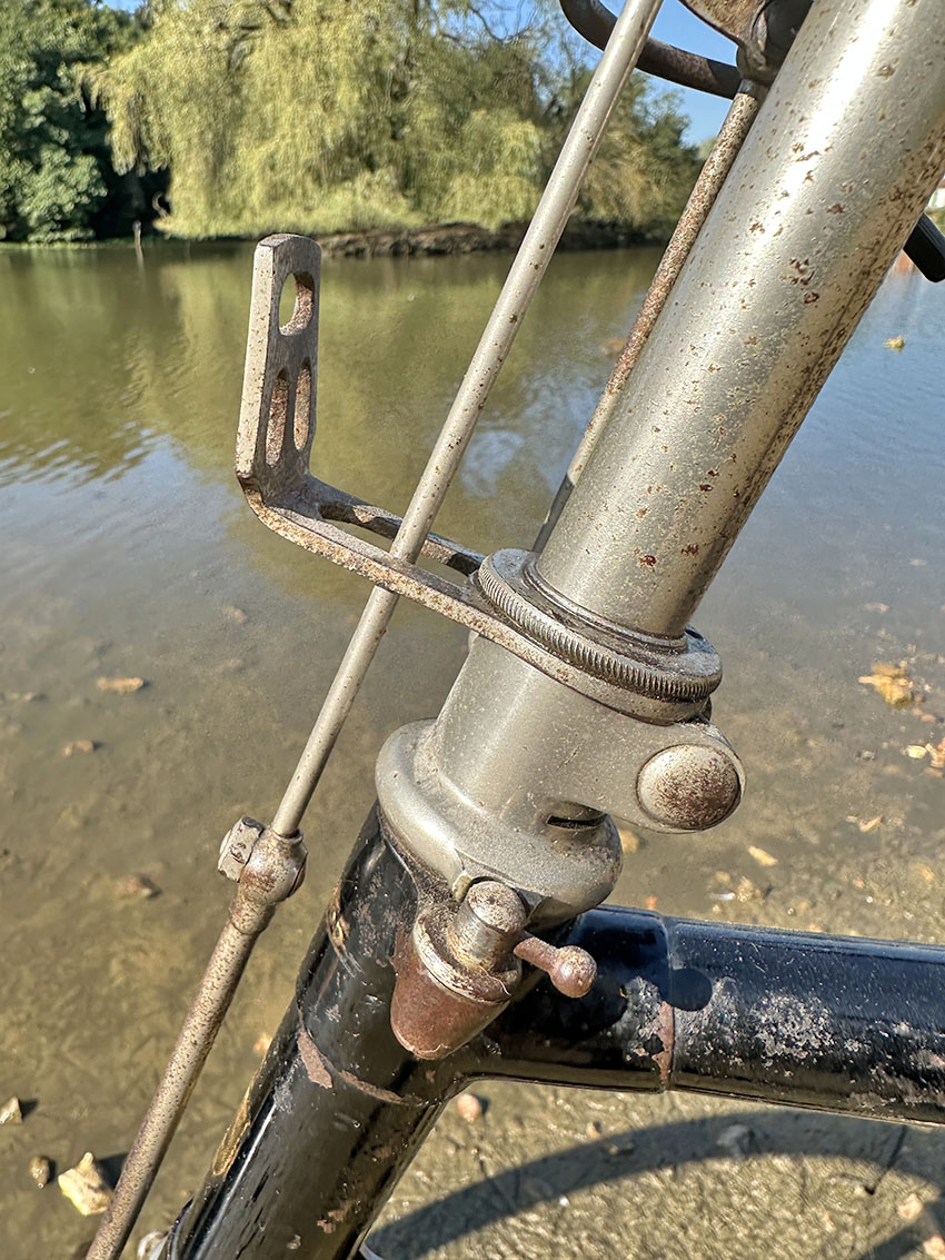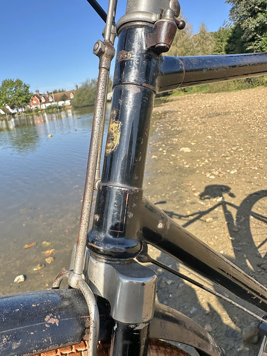 I bought this Triumph from Terry, who is a retired blacksmith. When he got it around 12 years ago, the bottom of the seat tube had been damaged where it meets the top bb lug. Triumphs are particularly lightweight machines, and I had another one some years ago with damage here, so I assume this might have been a weak point. As Terry was a blacksmith at the time, he was able to effect a very professional repair. He tapped a 2 inch solid steel plug down through the seat tube, drilled and screwed it into the tube and then drilled and bolted it through the lug too. He told me the hard part was working out the diameter of the plug, as if it was too wide it might get stuck tapping it down the tube and if too narrow it would not act sufficiently to strengthen the joint. He says he didn’t want to braze it because the heat might weaken the tubing and spoil the original paint. Terry rode the Triumph regularly and I’ve ridden it too. It’s lovely to ride!