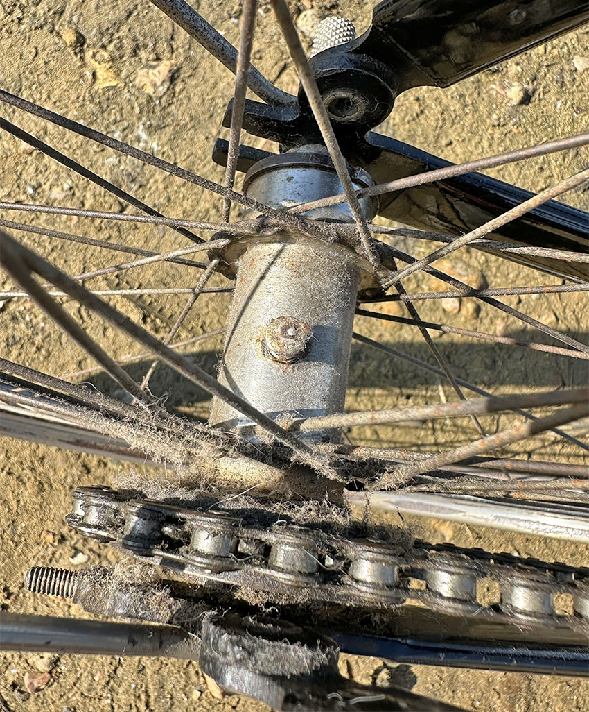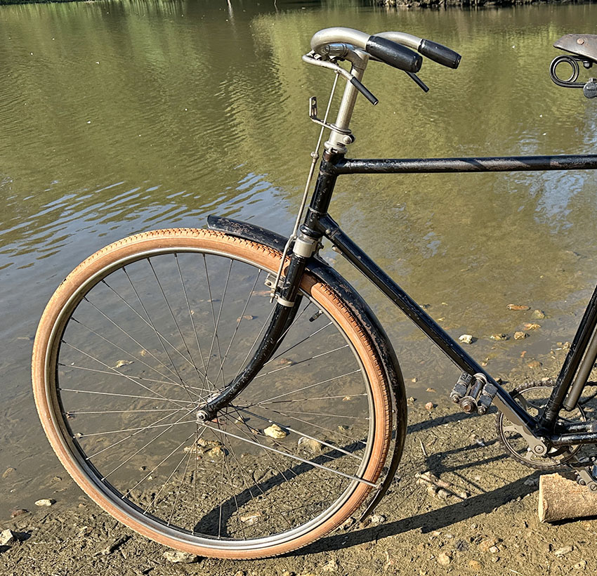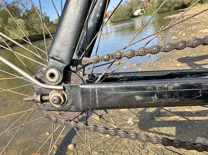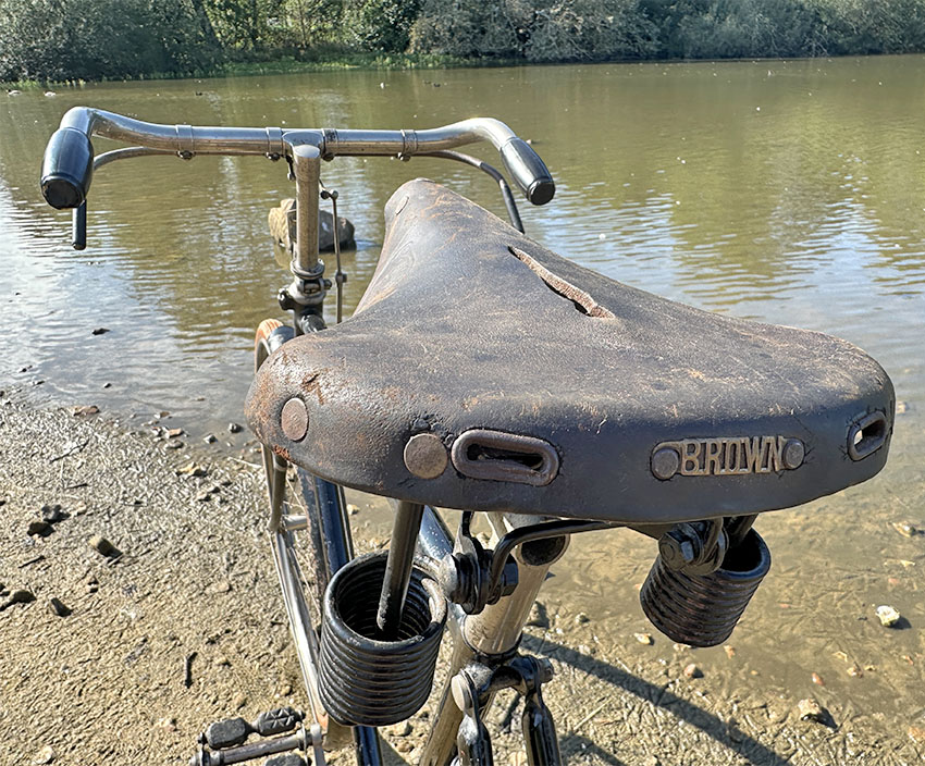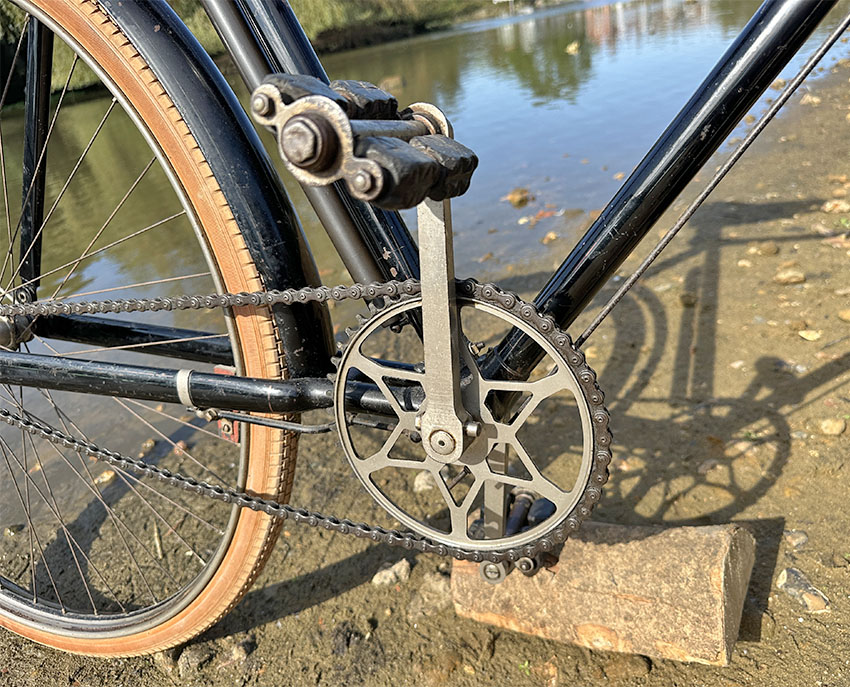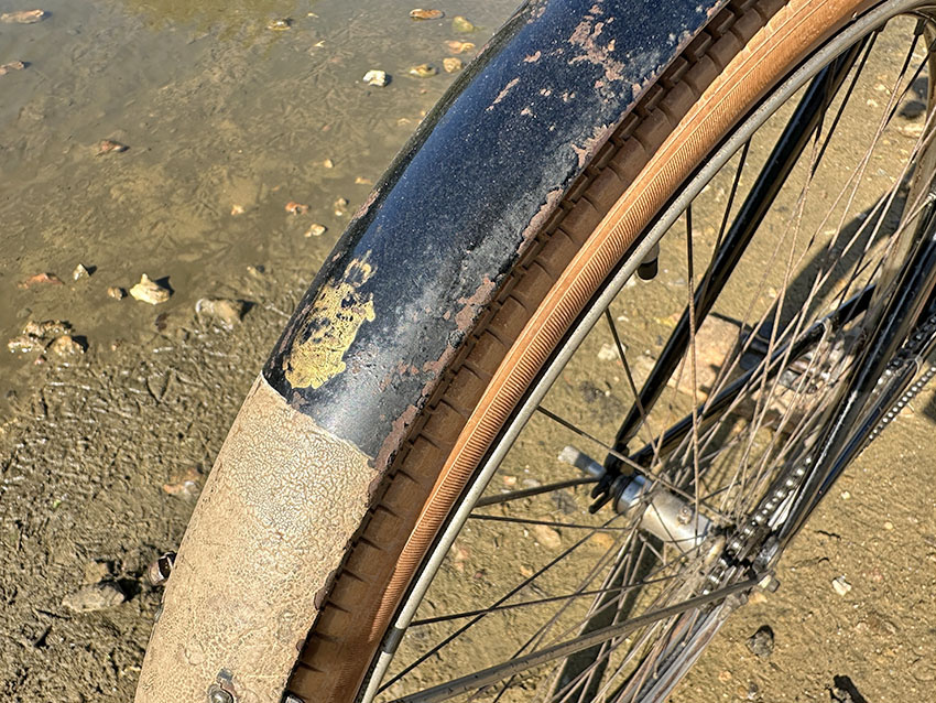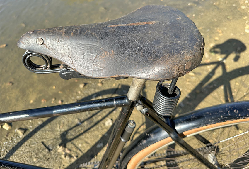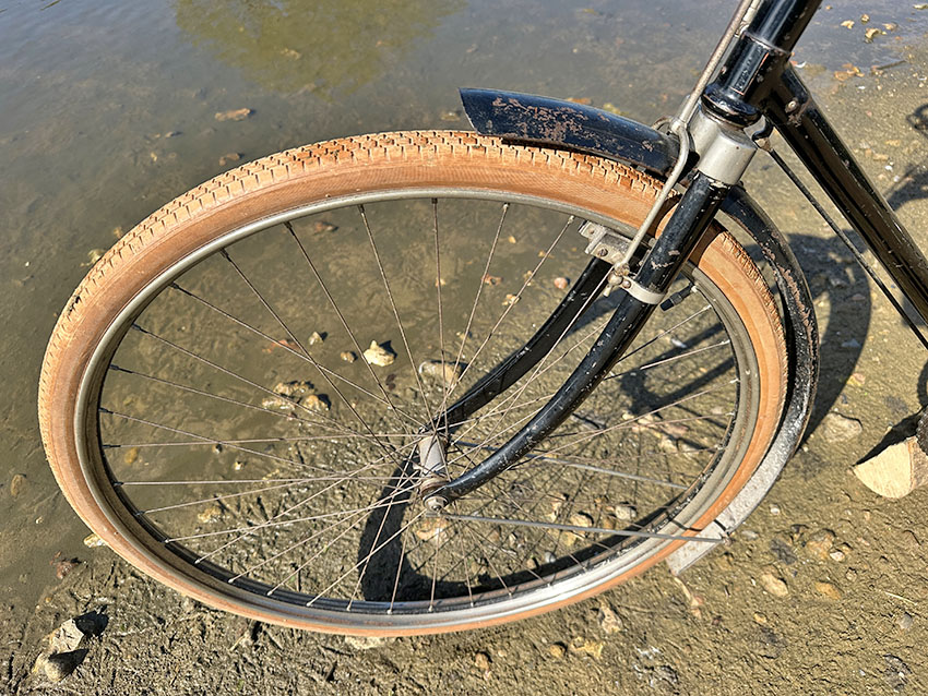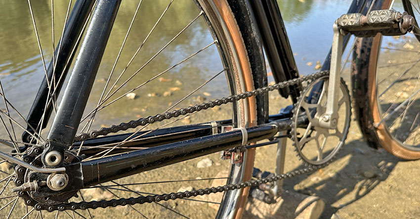 I bought this Triumph from Terry, who is a retired blacksmith. When he got it around 12 years ago, the bottom of the seat tube had been damaged where it meets the top bb lug. Triumphs are particularly lightweight machines, and I had another one some years ago with damage here, so I assume this might have been a weak point. As Terry was a blacksmith at the time, he was able to effect a very professional repair. He tapped a 2 inch solid steel plug down through the seat tube, drilled and screwed it into the tube and then drilled and bolted it through the lug too. He told me the hard part was working out the diameter of the plug, as if it was too wide it might get stuck tapping it down the tube and if too narrow it would not act sufficiently to strengthen the joint. He says he didn’t want to braze it because the heat might weaken the tubing and spoil the original paint. Terry rode the Triumph regularly and I’ve ridden it too. It’s lovely to ride!