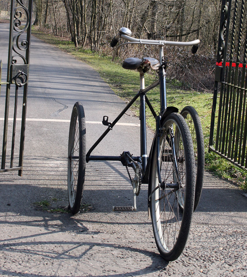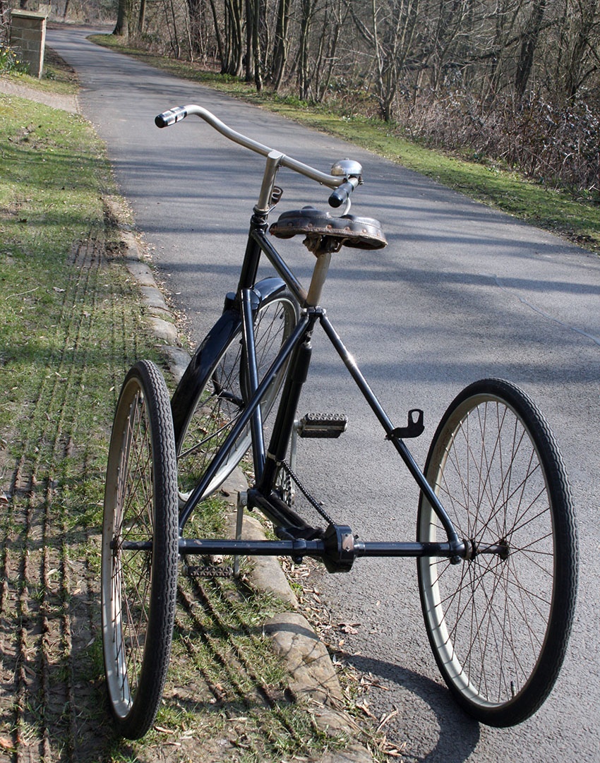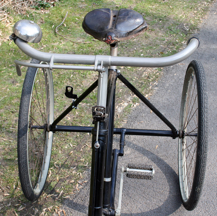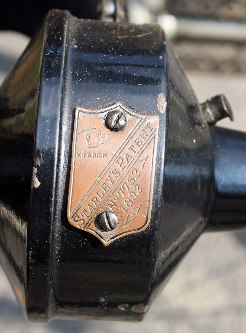The tricycle uses Abingdon fittings and rear axle. The diff has an Abingdon ‘King Dick’ plate to display Starley’s Patent no 7752 of 1892.
