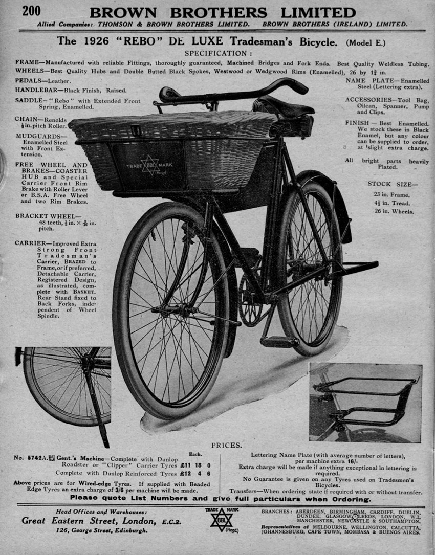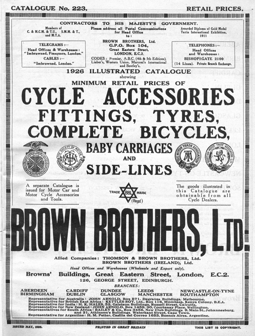 Brown Brothers Ltd was one of England’s top wholesale and general suppliers of bicycle, motorcycle and automobile parts and accessories. You could order a bicycle from the company either ready to ride, or in component form to assemble yourself using parts of your own choice. As well as their London depot, they had branches throughout the country; but a customer could also order via their comprehensive catalogue. According to their 1926 catalogue, the Gent’s Machine was ‘made up with Abingdon fittings and fitted with a freewheel.’