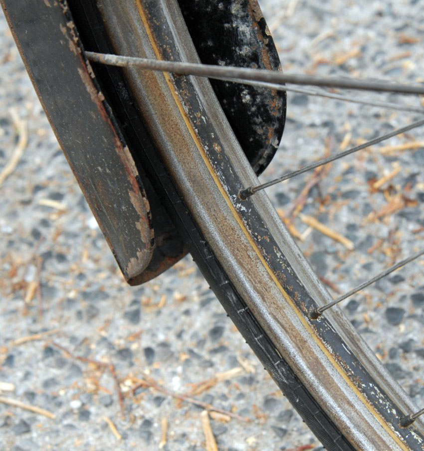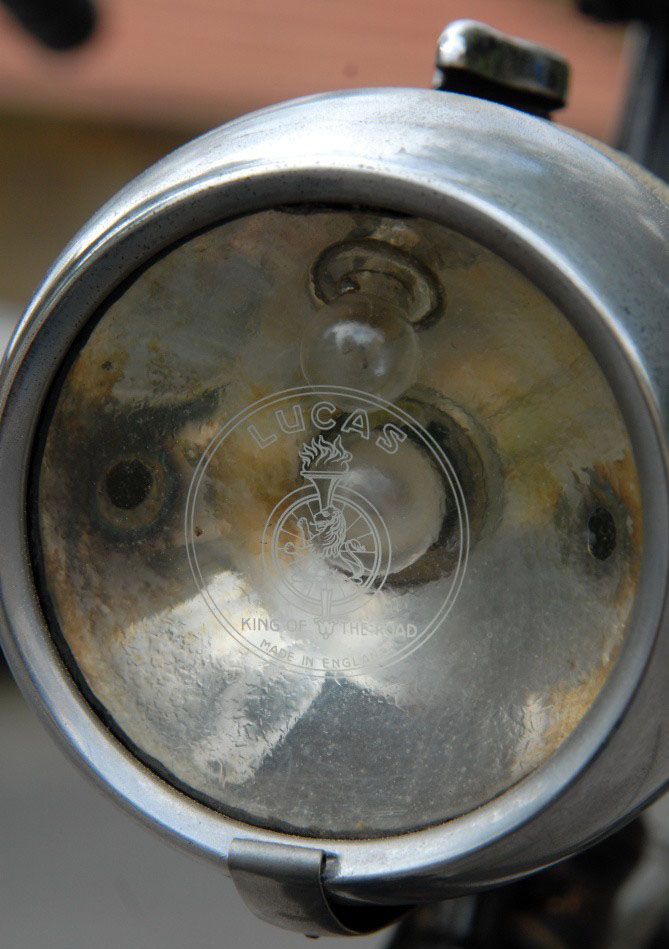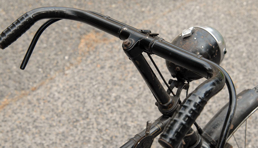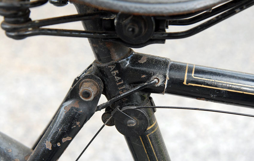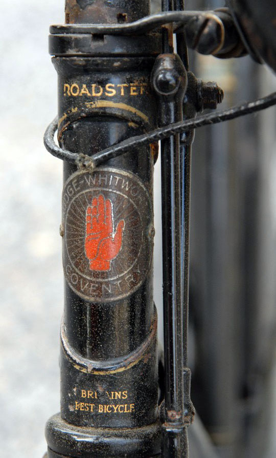 The difference between this top-of-the-range ‘Model 78’ Roadster and the other two similar roadsters that they offered for sale in 1937 is that the ‘Model 78’ is fitted with a Brooks ‘Soft Top’ saddle rather than a leather saddle, and also has an option for the Rudge-Whitworth patent ‘coupled brakes.’ This arrangement allowed both front and rear brake to be applied when either lever was squeezed. Observe, in the photo above, holes in each of the brake fittings at the centre of the handlebar: when a bolt was fitted between them the coupled brake was enabled. Not everyone liked using coupled brakes, so often, as in this case, the bolt was removed.